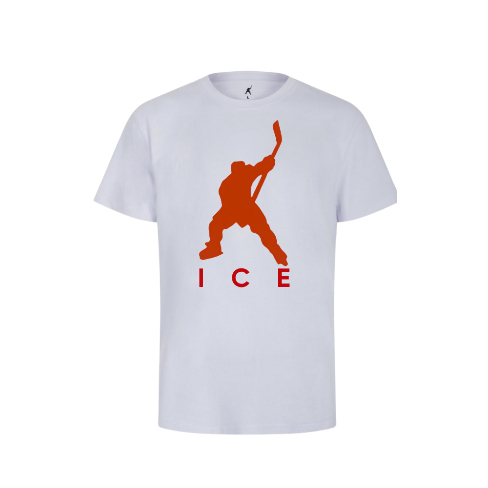 Футболка с красным средним хоккеистом гель и надписью под ним ICE